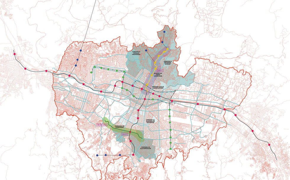 Por lo tanto, los 'corredores de movilidad' generados a través de la red de infraestructura extendida se entienden como espacio público y como alternativas a la conectividad urbana de la ciudad. Se han formulado dos estudios de alcance similares dentro del tema de la movilidad y la integración social-espacial. El primero se centra en los 'corredores de movilidad' de la cuenca del arroyo Santa Elena, donde se abrió una nueva ruta de tranvía en 2015. Otro estudio de alcance utiliza una ruta no desarrollada como línea de base. El corredor del futuro tranvía a lo largo de la Carrera 80 es un corredor de movilidad donde se planifica una ruta de tranvía pero el trabajo aún no ha comenzado.